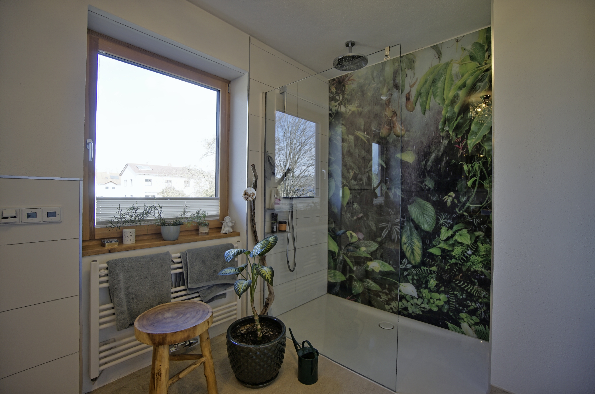 • ein sehr helles, neu gestaltetes Badezimmer mit Wanne und Dusche,