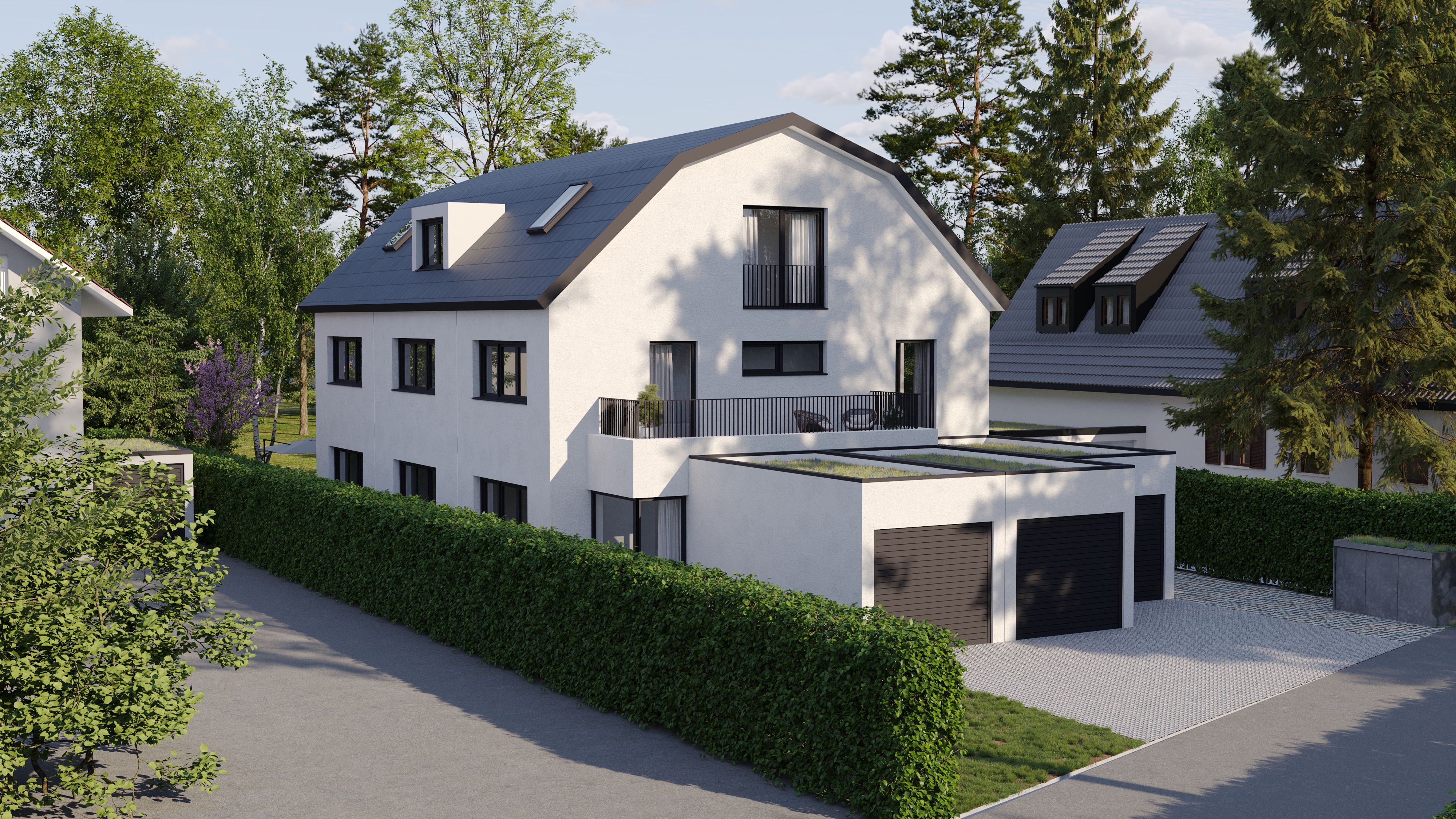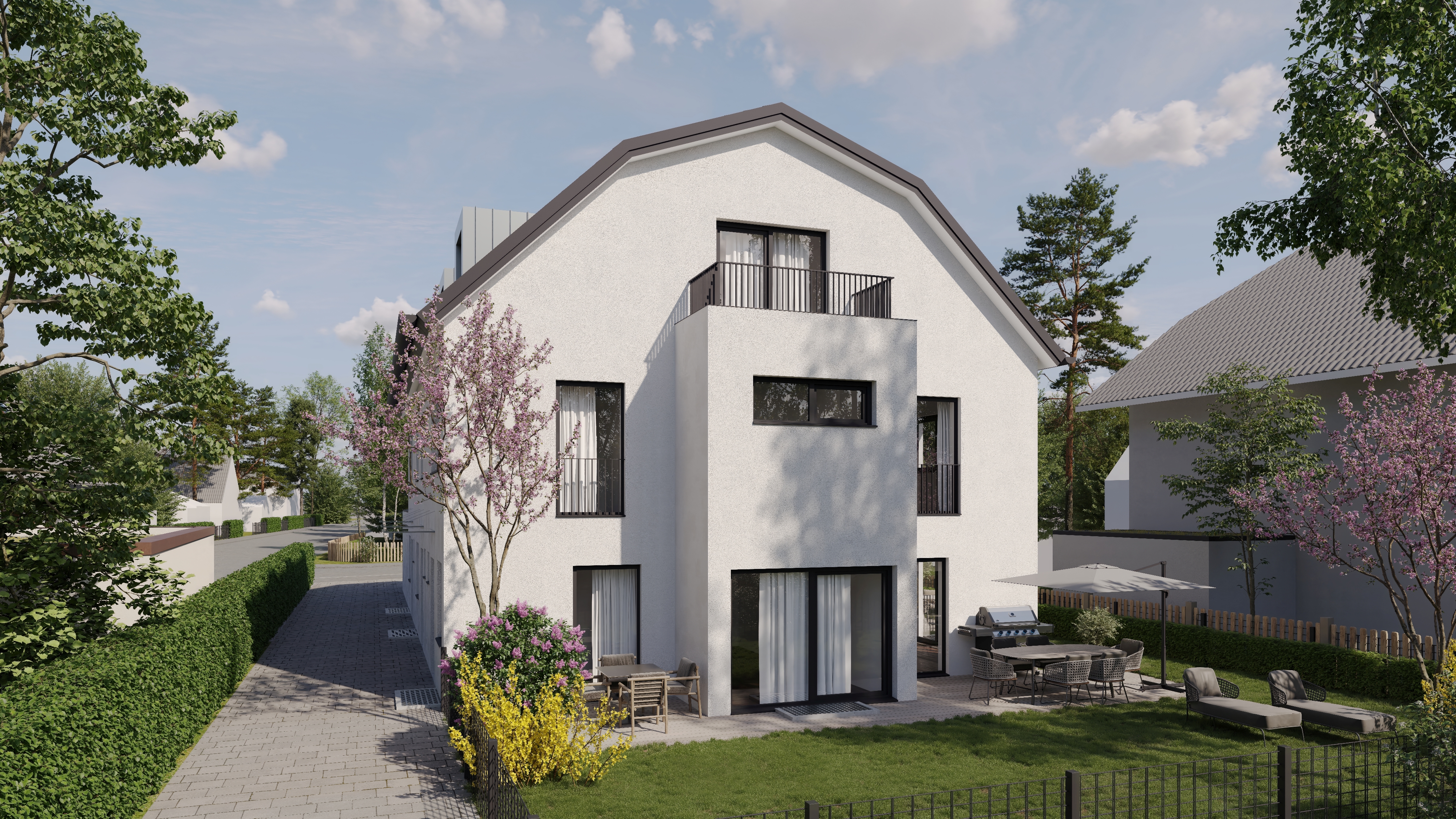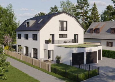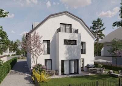 Die Gebäude mit einer Wohnfläche von 150-159 m², auf einem rund 675 m² großen Grundstück an der Nordwestseite der Landeshauptstadt München befindlich, ist nicht nur in einer traditionell – gewachsenen Wohngegend gelegen, sondern wird durch die Ausrichtung nach Ost, Süd und West auch optimal belichtet.